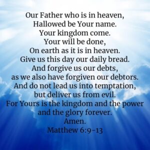 It begins by our acknowledging God, our heavenly Father, His Name is reverend, and honored. By saying; Your Kingdom come, Your will be done, we invite God to have His way, and not our own, so His will can be done in our lives. We ask God to give us our daily provisions. This covers our needs, great and small. We ask God to forgive our sins as we forgive others whom wronged us. Forgiveness is meant to be given and received. We ask God to help us avoid temptation, to not sin; and to deliver us from the hand of the enemy, Satan. We finish the prayer by acknowledging God’s supremacy, His power and glory, forever. Amen