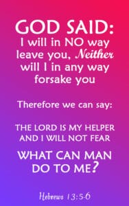 Today’s Scripture image is taken from Hebrews 13:5-6. Notice what God said in His promise. He gives hope and encouragement for times we feel alone, and when circumstances have us fearful. Another great promise is found in 2 Corinthians 6:18: “I will be a Father to you, and you shall be my sons and daughters, says the Lord Almighty.” Let’s read more of God’s promises found in the Bible